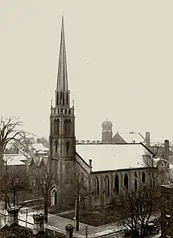 The cornerstone of the church was laid on Monday, August 19, 1844 by Bishop John Strachan[4] and the church opened as St. George the Martyr Anglican Church on November 9, 1845. The original church was located at 205 John Street, on land donated by the Boulton family (who lived in The Grange). It was the third Anglican parish in the city, after St. James Cathedral and Little Trinity. The Gothic Revival style church with 150-foot spire was designed by Henry Bowyer Lane and the bricks were built from clay from Ramsden Park.[3] The parish hall (now the church's place of worship) was constructed in 1857 by Kivas Tully and the rectory (now artist studios) was constructed in 1865 by Gundry & Langley.[5][6]