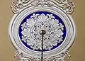 Inside, St. James Church is dominated by Potts' trompe-l'oeil frescoes, which cover all four walls beginning at the dado and rising to and covering the barrel vaulted ceiling. The walls are painted to simulate recessed panels which rise to a painted cornice. Potts then painted a row of coffers around the four sides of the ceiling which frame a large panel that is decorated with simulated plaster scrollwork. In the center of the ceiling is a painted medallion with a profusion of scrollwork. Apart from the ceiling, Potts lavished much detail on the wall behind the chancel, where four fluted pilasters rise to support an entablature and cornice, creating a visual opening to a barrel vaulted apse with coffered ceiling, all painted onto the flat wall. The frescoes conceal a door which opens into the vestry that is centered on the rear wall of the church. In the 20th century, Linda Croison and Philip Ward restored the frescoes, but preserved patches of Potts' original work in the back of the nave.