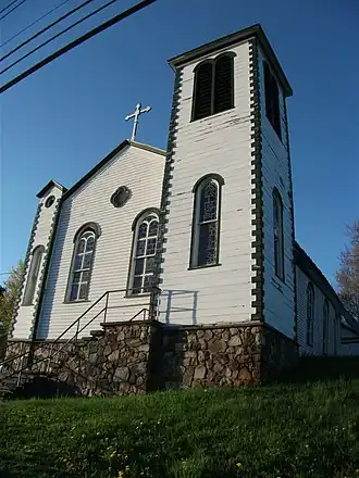St. Mary's of the Mountain Church was an historic Roman Catholic church on New York State Route 23A in Hunter, Greene County, New York. The church was completed in 1839 and is a one-story, four by two bay, post and beam frame structure on a modern concrete foundation. It features a moderately pitched gable roof, narrow clapboard sheathing, two engaged corner towers, and a Romanesque style engaged entry / bell tower. Also on the property is the parish cemetery.[2]