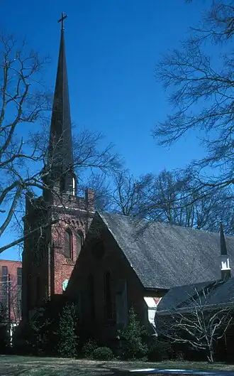 The church was built mainly of finely ornamented local brick on a simple nave plan, with lancet windows between buttresses. The tower in the northwest corner is topped by an octagonal spire added in 1893.[1] It was added to the National Register in 1975.