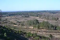 St Catherine's Hill, together with Ramsdown and Blackwater hills, comprise a 3-mile (4.8 km) long ridge running roughly north to south between the Avon and Stour valleys just to the north-west of where the rivers converge in the borough of Christchurch in Dorset.[11][30][31] The top of this ridge is almost a level plateau, 45 metres (148 ft) above sea-level at the southern end and 49 metres (161 ft) in the north. St Catherine's hill, in the south, forms the highest point of this three hill chain at 53 metres (174 ft) and has some of the steepest slopes at 1:1 or 45°.[30][31] The 400 acres (160 ha) site is a mixture of woodland and heath and is part of a larger Site of Special Scientific Interest (SSSI). The eastern slopes and foot of the hill, an area referred to as the Town Common, is almost exclusively open heath and as such has also been designated a Special Protection Area (SPA) and Special Area of Conservation (SAC).[18][31]