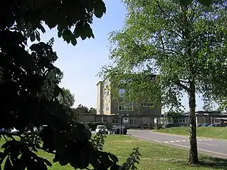 St Crispin's School was the first of the Ministry of Education's prototype prefabricated schools. It was built between 1951 and 1953 by the Ministry of Education's own team of researchers into rational school building (David Medd and Mary Crowley) under the direction of S. A. W Johnson Marshall. The work was inspired by that of the Hertfordshire Architect's Department.[3] In the post-war years, with an increasing demand for school places, the government was under pressure to reduce costs but without compromising the school building programme. The aim was to establish new levels of cost efficiency for both erection and running costs. The building is of light steel construction with components of modular sizes. The classrooms were all originally located in a four-storey block above the main entrance with a central courtyard and a rambling series of inter-connected mostly single-storey buildings which provided accommodation for a hall, a gym and specialised teaching spaces for arts and crafts. The new techniques speeded up the building process so much that the school was able to open five months ahead of the planned schedule. It is widely believed that the school tower was designed with the potential to be modified to a hospital in times of national emergency, though no records have been found to substantiate the claim.[4] The informal layout and unassuming architecture influenced the layout and construction of schools across the country.[5] St Crispin's was classified as a Grade II listed building by English Heritage on 30 March 1993.[6]