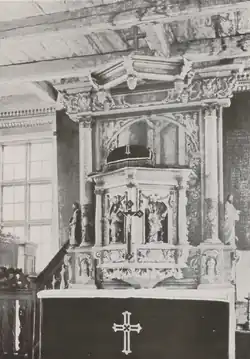 According to accounts from around 1640, the "church on the hill" (Old German aufm Berge) was built by the Protestant congregation before 1551. Possibly as a new temple on the site of the earlier chapel or possibly just renovated and expanded for new needs. The building at that time was still wooden. It was used by evangelicals from rural areas of the Bytów parish. Sermons in the local dialect were preached here by, among others, Szimón Krofey, a pastor who, with financial help from Barnim X, published "Spiritual Songs" in the Kashubian dialect in print in 1586.[2] During the Counter-Reformation period, the right to possess a church by Protestants was effectively defended, so that throughout the period the temple belonged to them.