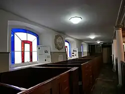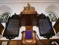 The church retains a set of furnishings, mostly from the 18th century, including a set of box pews and a high central double-decker pulpit and sounding board. The coat-of-arms of King George III (pre-1801) and two carved timber commandment boards in German hang in the church. The Royal Arms were required to be erected in Anglican churches but were adopted by nonconformist congregations voluntarily, as a mark of loyalty. There are donations boards for the church and adjoining former church school and among the donors listed is the King of Prussia.