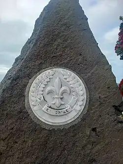 The Memorial is composed of rough granite rocks stacked upon each other, with a metal memorial plaque inset. The marble roundel above the inscription is a scout emblem, the fleur-de-lis, with silver ferns on either side. The scout motto of "be prepared" is inscribed upon the roundel.[8] The shape of the stone at the top of the memorial is designed to be the general shape of a scout's hat of the time in 1916.