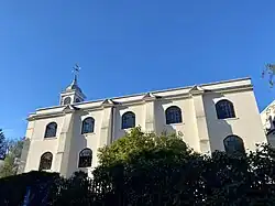 During a period in which much of the surrounding area was being developed, a new church was considered as an essential local amenity. The copyhold for the site of the church on Downshire Hill was purchased from the Manor of Belsize in 1812 by a group which passed this in 1817 to a trio comprising Christian minister James Curry, "speculative"[1] builder William Woods and lawyer Edward Carlisle, Woods being involved in other development, both in Hampstead and elsewhere in London.[2] Curry had offered to pay the cost of the building project if he was appointed minister.[3] The dedication of the new church to St John may indicate that it was originally intended as a chapel of ease for the parish church of St John-at-Hampstead.[3]