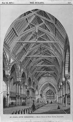 St Jude's Church, Courtfield Gardens, Kensington, London, was designed by architects George Godwin and Henry Godwin, and built between 1867 and 1870; the tower and spire were constructed in 1879. It was built on the northern portion of Captain Robert Gunter's estate. The project was overseen by Reverend J. A. Aston, and financed by John Derby Allcroft, a wealthy glove manufacturer.[1] The construction, not including the tower, pulpit, font and organ cost £11,300, and was undertaken by Myers & Sons.[2]