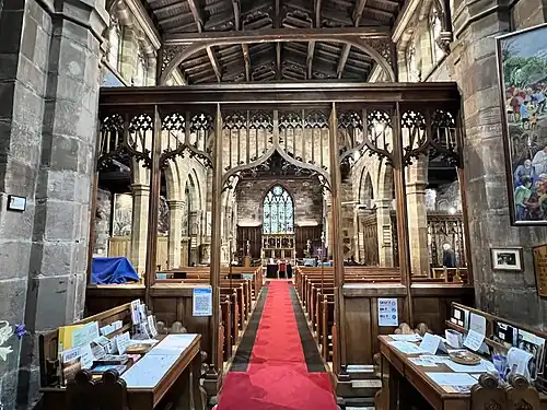 The exterior of the church, largely rebuilt and restored in the late 19th century, consists of red sandstone ashlar with some grey sandstone in the tower.[5][6] The angle-buttressed tower features battlements that were added in the 16th century and crocketed corner pinnacles from the 19th century. St Mary's has a peal of eight bells, the oldest of which dates to 1700. The tenor bell weighs 1,960 lb (890 kg) and the treble 616 lb (279 kg).[2]