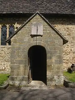 The south doorway, described as the "best"[7] and "most interesting architectural feature" of the church,[8] is narrow, tall and surrounded by bands of characteristically Norman reeding[7][8][10] similar to the style of nearby St Peter and St John the Baptist's Church in Wivelsfield.[8] It has a splayed inner archway with re-cut imposts.[14] Nine voussoirs make up the arch. The dimensions on the inside are 46 inches (120 cm) wide, 9+1⁄2 feet (2.9 m) high to the top of the arch and 19 inches (48 cm) deep.[14] The "extremely interesting" decoration on the exterior consists of carved v-shapes (not identical to standard Norman chevron ornamentation) with inward- and outward-facing points at various intervals.[22]