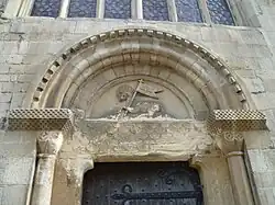 The church was built in the 12th century and includes a number of surviving Norman features. One of the most significant is the well-preserved carved tympanum over the west door (opening into Southgate Street), which depicts the agnus dei (lamb and flag), symbols of the Resurrection of Christ, based on the Book of Revelation.