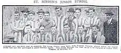 The club reached the Renfrewshire Junior Cup final in 1897–98,[6] but did not re-emerge for the 1898–99 season.[7] The club was re-started in 1912 and successfully applied to join the Scottish Junior League.[8] This attempt lasted only the 1912–13 season, the club finishing 10th out of 12 in the Junior League second division,[9] but the Saints revived the club once more in 1916, applying to join the Glasgow & District Junior League.[10] In the club's first season back, it won the Scottish Junior Cup, bearing Renfrew 1–0 a final replay at Firhill, Durward's winning goal being the only one Renfrew conceded in the competition.[11] Goalkeeper Alec Hart pulled off a late save of such brilliance that the club presented him with a fresh kit as a reward.[12] As at 2025 St Mirren remains the only senior name on the trophy.