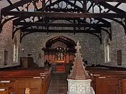 The church is built of limestone, with a slate roof. It has a three-bay nave and a lower two-bay chancel, a north aisle, and a south porch. The tower is at the west end and has two stages, with diagonal buttresses. It has a three-light west window, a clock on the south side, two-light windows to the belfry, and battlements with corner finials. The east window of the chancel also has three lights, and stained glass made by William Wailes. There is a queen post roof.[2]
