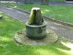In the churchyard is a stone sundial of unusual design dating probably from the 18th century. It consists of a circular plinth on a circular stone step which carries a battered cruciform stem with an octagonal cap. The dial and gnomon are copper. It is listed Grade II.[8] At the churchyard gate is an 18th-century mounting block.[5] Also in the churchyard is the war grave of a First World War Canadian soldier.[9]