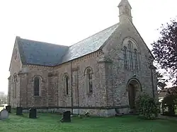 St Paul's is built of coursed and squared rubble, with a slate roof and bellcote, in a Neo-Norman style. The inside is made up of a two-bay nave, transepts and chancel with a vestry.[2]