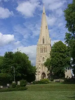 The building is axially orientated towards the chancel and Rood Screen and consists of a nave, two aisles, a south aisle chapel, a south porch, and an imposing west tower and spire, the walls being constructed of limestone with ashlar dressings. Though claimed to be 202 feet high, the spire height, according to a 2011 survey by architect Julian Flannery, is actually 176 feet (54 metres) high.[7]