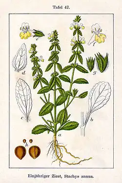 3. ^ "Stachys annua annual yellow woundwort". The Royal Horticultural Society. Retrieved 2 January 2021.