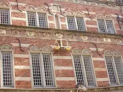 A historical document from 1330 mentions a weigh house where all the merchants and tradesmen had to weigh their goods. From 1440 or even earlier, the building was situated in Langenstraße, one of the main Bremen thoroughfares. Between 1586 and 1588, a new building was erected on the same site by Lüder von Bentheim.[1] Built of brick in the Weser Renaissance style, it was decorated with sandstone ornaments. Pilasters sprang up from each of the gable ledges while the windows were surmounted with shell-shaped ornaments. Above the second-storey window, there was a putto frieze depicting figures. A sign with a golden balance symbolised the building's role. From the street, the building was accessed through two round arches. The upper storeys consisted of storage rooms for the city council's grain reserves. The weigh house was in use well into the 18th century. From 1877, the tax and excise offices were housed in the building, together with the land-registry office until 1925. From 1927 until its destruction, the building was the headquarters of the first Bremen broadcasting station NORAG (Norddeutsche Rundfunk AG).[2]