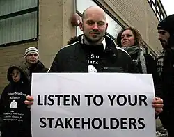 Stakeholder theory has seen growing uptake in higher education in the late 20th and early 21st centuries.[26] One influential definition defines a stakeholder in the context of higher education as anyone with a legitimate interest in education who thereby acquires a right to intervene.[27] Studies of higher education first began to recognize students as stakeholders in 1975.[28] External stakeholders may include employers.[28] In Europe, the rise of stakeholder regimes has arisen from the shift of higher education from a government-run bureaucracy to modern systems in which the government's role involves more monitoring than direct control.[29]