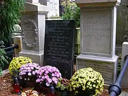 In the last year of life, suffering from a heart disease, he little worked. He died 31 May 1926 in Warsaw[15] and was buried at the Powązki Cemetery in Warsaw, in the tomb of his mother's family (section 11-1-7/8, cf. the information boards behind the entrance of the "Saint Honorata" gate in the category: "Plastycy", i. e. "Artists").