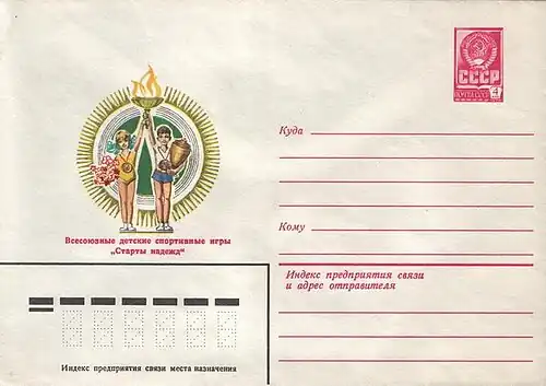 "Starty nadezhd" was a competition for children of classes 4th to 9th. A parallel class, like 4 "A" for instance, as one team competed in several sports with other parallel classes of the same school, like 4 "B", 4 "V". So, on the first level of the competition six best parallel classes for each secondary school of the country were determined, let's say 4 "B", 5 "A", 6 "V", 7 "A", 8 "B", 9 "A". Then, on the second level of the competition each of these parallel classes competed with corresponding best parallel classes of other secondary schools of the same district or town. Third level competition was held between best parallel classes of districts of the same oblast. The fourth level was contested between best parallel classes of oblasts of the same krai. The fifth level of the competition was held between best parallel classes of krais of the same republic. And the best parallel classes of 15 republics, i.e. 6 times 15 — about 100 teams in total, competed in the finals to determine the best parallel classes of the country.