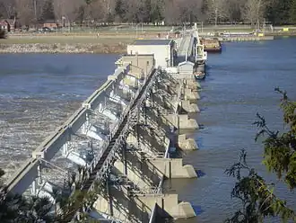 Starved Rock Lock and Dam features a straight-crested, reinforced concrete gravity dam 1,310 feet (400 m) long.[1] The dam consists of a head gate of 518 feet (158 m) and a controlled spillway of 714 feet (218 m).[1] The dam is 33 feet (10 m) wide at its base, 22 feet 3 inches (6.78 m) wide at the crest of the head gate and 50 feet 6 inches (15.39 m) wide at the crest of the spillway.[1] The dam's height above the riverbed varies from 21 to 34 feet (6 to 10 m).[1]