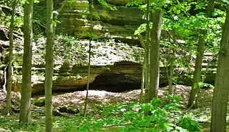 Shaky Shelter Site is the location of a prehistoric rock shelter site at the base of the sandstone bluff within the state park's Kaskaskia Canyon.[32] In 1991 subsurface tests of the 183 m2 shelter site were made and determined that evidence existed only for occupation by Upper Mississippian groups.[32] Shaky Shelter Site was added to the National Register of Historic Places on the same date, June 18, 1998, and as part of the same Multiple Property Submission as the Corbin Farm, Hotel Plaza and Little Beaver sites.[29]