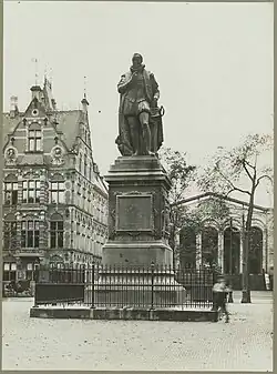 While travelling in Europe after World War I, biologist and physician Dr. Fenton Benedict Turck (1857–1932) purchased a bronze statue of William I (1533–1584), Count of Nassau, Prince of Orange, and national hero of the Netherlands.[1] William, known as "William the Silent" (Dutch: Willem de Zwijger) and "William of Orange" (Dutch: Willem van Oranje), was the main leader of the Dutch revolt against the Spanish that set off the Eighty Years' War and resulted in the formal independence of the United Provinces in 1648. For this reason, William is known as the "Father of the Fatherland" (Dutch: Vader des Vaderlands) of the Netherlands.[2][3] The statue is a replica of a similar monument created in 1848 by Dutch sculptor Lodewyk Royer (1793–1868) that was installed in Het Plein, a city square in the Hague's Oude Centrum (trans. "Old Center").[4] The plaster mold for Royer's original statue was kept in Brussels during World War I and after the war, the Dutch government permitted one copy of the statue to be made by sculptor Toon Dupuis (1877–1937) at the Fonderie Nationale des Bronzes, a foundry in Brussels, before destroying the mold.[4][5]