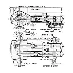 By 1925 the vertical arrangement of the engine had been taken advantage of to improve steam porting and access for maintenance. The Super-Sentinel engine used two camshafts: inlet and exhaust, placed near the crankshaft in the crankcase and operating the poppet valves through long pushrods. In the original wagon engine, all four valves were mounted at the far end of the cylinder from the crankshaft, requiring long narrow ports to the other end of the cylinder. With the locomotives the easily accessed vertical engine allowed a pair of these valves to be moved to the lower end of the cylinder, allowing for a short, efficient port with less 'dead space'.[23] The crankcase of the engine, together with the crosshead trunk guide, was enclosed and provided with oil splash lubrication. A small plenum was left exposed between the cylinder's piston rod stuffing box and another gland seal into the crankcase. This allowed any steam that did leak past the seals to be vented to the atmosphere, rather than condensing within the crankcase.[21]