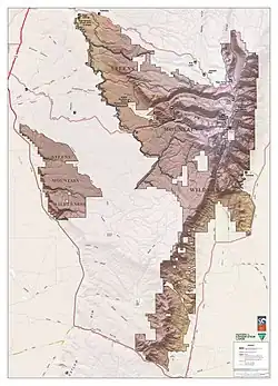 Steens Mountain is a large fault-block mountain in the northwest United States, located in Harney County, Oregon.[2][3] Stretching some fifty miles (80 km) north to south, on its east side it rises from the Alvord Desert at an elevation of about 4,200 feet (1,280 m) to 9,738 feet (2,968 m) at the summit. Steens Mountain is not part of a mountain range but is properly a single mountain, the largest of Oregon's fault-block mountains.[4][5]