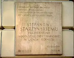 A commemorative plaque dedicated to Starzyński. The inscription at the top includes his most famous quote I wanted Warsaw to be great...
