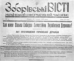 On 30 June 1941, with the arrival of Nazi troops in Ukraine, the OUN-B unilaterally declared an independent Ukrainian state ("Act of Renewal of Ukrainian Statehood").[68][69] The proclamation pledged a cooperation of the new Ukrainian state with Nazi Germany under the leadership of Hitler.[5] The declaration was accompanied by violent pogroms.[68][52] There is no evidence that Bandera actively supported or participated in the Lviv pogroms or acts of violence against Jewish and Polish civilians, but he was well informed about the violence and was "unable or unwilling to instruct Ukrainian nationalist military troops (as Nachtigall, Roland and UPA) to protect vulnerable minorities under their control". As German historian Olaf Glöckner writes, Bandera "failed to manage this problem (ethnic and anti-Semitic hatred) inside his forces, just like Symon Petljura failed 25 years before him."[70]