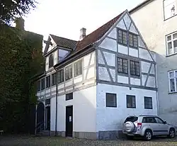 The main wing's gate is flanked by two rough iron lamps. The gate opens onto a cobbled courtyard. The gate in the wall on Sofie Brahe Gade was created by Christian Krøyer in the 1920s. The half-timbered building in the courtyard contained stables and room for several carriages. The upper floors served as servants quarters.[3]