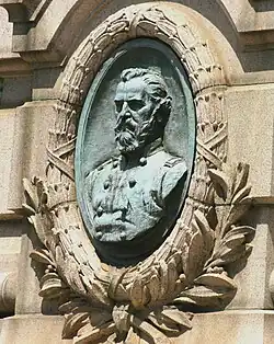 A resolution passed by the Senate in April 1902 provided the memorial to be erected on any of the city's public lands other than the Library of Congress and Capitol grounds.[7] The site chosen, at the corner of 7th Street and Louisiana Avenue (now Indiana Avenue) NW, was selected by a commission appointed by Congress. The commission consisted of Secretary of War Jacob M. Dickinson, Senator George P. Wetmore, Representative Samuel W. McCall, General Louis Wagner, and Thomas S. Hopkins.[8] The soil at the chosen site, present-day Indiana Plaza, could not support the memorial's weight, so the concrete foundation had to be expanded.[6]