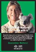 Irwin was involved in several media campaigns. He enthusiastically joined with the Australian Quarantine and Inspection Service to promote Australia's strict quarantine requirements, with advertisements and posters featuring slogans such as, 'Quarantine Matters! Don't muck with it'. His payments for these advertising campaigns were directed into his wildlife fund.[47]