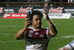 Matai travelled to England with Manly for the 2012 World Club Challenge match against 2011 Super League champions Leeds Rhinos, playing at centre in the 26–12 loss at Headingley Stadium.[27] On 25 May 2012, Matai re-signed with Manly for a further three years to the end of the 2015 NRL season.[28] Midway through the 2012 season in Round 12, Matai was charged with a high tackle in a game in Manly's 22–4 loss against the Penrith Panthers at Penrith Stadium.[29] This resulted Matai to his thirteenth trip to the NRL Judiciary, equalling the record set by Michael Crocker.[30] In Week 1 of the 2012 finals series against minor premiers the Canterbury-Bankstown Bulldogs, Matai played his 150th NRL career match in Manly's 16–10 loss. After the match, Matai was suspended for a high shot on Canterbury's Sam Perrett and missed the rest of Manly's finals matches.[31][32] Matai played in 18 matches and scored 6 tries for Manly-Warringah in the 2012 NRL season.