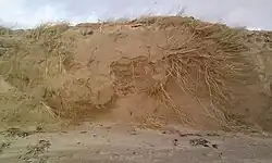 Rarer sand dune vegetation such as Babington's Orache (Atriplex glabriuscula) and Isle of Man cabbage (Coincya monensis monensis) have been recorded,[1] together with typical sand dune wild flowers, including European marram grass (Ammophila arenaria), lyme grass (Leymus arenarius), kidney vetch, tufted vetch, common restharrow (Ononis repens), European searocket (Cakile maritima), sea campion (Silene maritima), prickly saltwort (Salsola kali), Scottish bluebell (Campanula rotundifolia), bird's-foot trefoil, ragwort (Senecio jacobaea), sea mayweed (Tripleurospermum maritimum) and sea sandwort (Honckenya peploides). Plants such as lyme grass were so important in stabilising sand dunes that during the 17th-century reign of William III, the Scottish Parliament passed a law protecting it.[7]