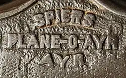 A pivotal role in the firm's destiny was played by William McNaught from shortly before the turn of the twentieth century possibly until the 1920s.[8] He almost certainly had a hand in the experimental work that took place at the workshop in the face of competition from the mass-produced cheaper American models flooding the market. The Spiers 1909 patent application shows a design that led to the Plane-O-Ayr range of panel and jointing planes that probably came on the market around the time of the patent's acceptance in March 1910.[9]