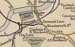 The first station, opened by the West End of London and Crystal Palace Railway, was on the line between Pimlico and New Wandsworth stations, located just south of the bridge under the LSWR lines.[1] It was opened on 29 Mar 1858[2][3] and closed on 1 December 1858.[2][4]