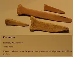 In the 19th century centralised industrial production of molded three-arm stilts began common in the UK with Staffordshire exporting them to other parts of the country.[13] Some of the manufactures appear to have used distinctive mold designs.[13]