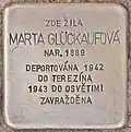 Glückaufová, MartaMarta Glückaufová was born in 1889. Most probably she was the daughter of Albert Glückauf and Franziska née Lebenhart and had a sister named Olga. In 1942 she was deported to Theresienstadt concentration camp, in 1943 to Auschwitz concentration camp. There she was murdered by the Nazis.[19]