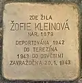 Kafková, Beila BertaBeila Berta Kafková was either born on 22 May 1883 or on 22 May 1884.[24] Her parents were Bernard Issakhar Kafka and Elenora Kafková. She was married to Max Beniamin Meir Kafka. The couple had two sons, Osvald (born 1908) and Otakar (born 1919), see above. She was a housewife. On 26 November 1942, she and her sons were deported from Klatovy to Theresienstadt concentration camp by transport Cd. Her transport number was 127 of 651. According to two serious sources she died in Theresienstadt, most probably on 13 December 1942. Therefore, the inscription on the Stolperstein, indicating that she was deported to Auschwitz in 1943 and was murdered there, might be wrong.[25][26]