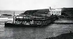 Dunmore collided with a naval longboat off Mrs Macquarie's Point in Sydney Harbour in 1909, resulting in the drowning of 15 sailors from HMS Encounter.[50] Outbound from Sydney, Dunmore was involved in another collision, in 1914, off the Heads of Sydney Harbour; this time she collided with another 'Stone Fleet' ship, the steel-hull Kiama, which was inbound and fully-laden with crushed stone. Although Dunmore was left with a gaping hole in her bow, she remained afloat.[51] In 1915, the Dunmore ran aground on a reef near Bradley's Head, but sustained little damage.[52] In 1918, the Dunmore was involved in yet another collision—this time with the tug Champion—and sustained damage; a Court of Marine Inquiry found the Champion's master responsible.