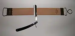 The stropping process involves sliding the razor blade flat on the strop; upon reaching the end of the cloth or leather near the suspension ring, the blade is turned about its back (clockwise for a right-handed barber; counter-clockwise for a left-handed one) until the cutting edge touches the strop. It is then pulled toward the rectangular handle of the strop with back and cutting edge flat on the strop as before. The blade is moved in a slightly diagonal direction so to give every point of the edge a chance to touch the strop, without applying too much pressure. This process aligns the cutting edge properly with the back of the blade, avoiding "bumps" on the cutting edge. Rotating the blade on the strop about the cutting edge can damage it because such use will impact the micro-alignment of the edge.[50] Depending on use and condition, the blade can be sharpened occasionally by using a razor hone.[54][55] Strops prepared with pastes containing fine grit are also used for honing but are not recommended for the inexperienced user, as they can easily rake off the edge if they apply the wrong amount or exert too much pressure.[39][56]