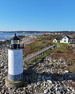 The Straitsmouth Island Light is a lighthouse located on Straitsmouth Island, in Rockport, Massachusetts. The original tower was built in 1835, and replaced by a second tower in 1896.[2] It was automated in 1967, and is still in operation. The United States Coast Guard Light List[3] description is "White cylindrical tower". The actual light is 46 feet (14 meters) above Mean High Water. The Light List name is "Straightsmouth Light", but the island is "Straitsmouth Island" on NOAA charts.