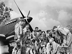 ![]() Pilots of No. 452 Squadron RAAF being briefed by the Commanding Officer, Squadron Leader L. T. (Lou) Spence, circa December 1944 (right, kneeling) | |||||||||||