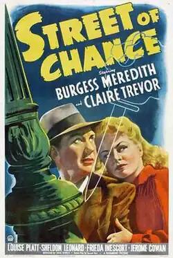 Street of Chance is a 1942 American film noir mystery film directed by Jack Hively and starring Burgess Meredith as a man who finds he has been suffering from amnesia and Claire Trevor as a woman who protects him from the police, who suspect him of murder. He is suspected of the murder of the wealthy Harry Diedrich. The only eyewitness to the murder was Harry's mute grandmother, and she can only communicate with others through sign language.