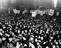 Between 1930 and 1941, 27,000 work stoppages led to a loss of 172 million labor days, and about 90 deaths.[1] As the economy declined workers were angry but management was losing money and could not afford to raise wages, so the strikes usually failed. This caused desperation among workers and union leaders.[2] However, as the economy shot up starting in summer 1933, labor knew that management would negotiate rather than lose markets and profits. The New Deal unintentionally fueled labor militancy, giving unions a powerful tool in the National Labor Relations Act of 1935, known as the "Wagner Act." It set up the National Labor Relations Board. Rank-and-file workers, who initiated most stoppages by walking out or sitting down, weighed their lost wages versus the long-term benefits of union membership if they won. The main gains were made by the old established unions belonging to the American Federation of Labor (AFL), and even more dramatically by the Congress of Industrial Organizations (CIO), which split from the AFL in 1935. John L. Lewis of the coal miners' union used his organizers to unionize the nation's steel, auto, rubber and electrical plants. Organized labor's unprecedented accomplishments during this era were impossible without the aid of strikes. However the AFL and CIO became bitter rivals in 1937, as the economy suddenly went into reverse and the conservative Republicans made major gains in the 1938 elections.[3]
