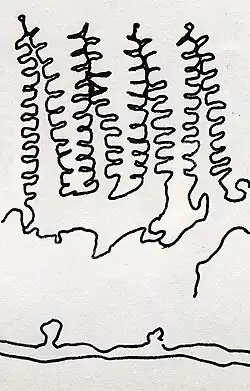 Crystal fibres, formed of hexagonal arrays of hollow nanofibres, create the bright iridescent colours of the bristles of Aphrodita, the sea mouse, a non-wormlike genus of marine annelids.[10] The colours are aposematic, warning predators not to attack.[21] The chitin walls of the hollow bristles form a hexagonal honeycomb-shaped photonic crystal; the hexagonal holes are 0.51 μm apart. The structure behaves optically as if it consisted of a stack of 88 diffraction gratings, making Aphrodita one of the most iridescent of marine organisms.[22]