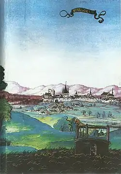 The town of Strzelce Opolskie was situated on the trade route KrakówWrocławDresden. The settlement was initially surrounded by a thick forest. An original wooden hunting lodge was probably replaced by a stone structure in the 13th century. The castle was first mentioned in Liber fundationis episcopatus Vratislaviensis as Castrum Strelecense. The document is believed to be compiled in 1305.[1][2]