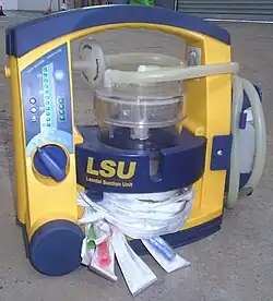 Suction devices may be mechanical hand pumps or battery or electrically operated mechanisms. In many hospitals and other health facilities, suction is typically provided by suction regulators, connected to a central medical vacuum supply by way of a pipeline system. The plastic, rigid Yankauer suction tip is one type of tip that may be attached to a suction device. Another is the plastic, nonrigid French or whistle tip catheter.[3]